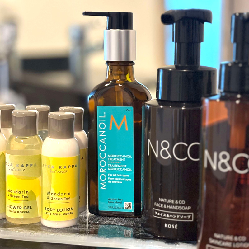 スキンケアアイテムにはハーバルグリーンの香りが心地よい「N&COシリーズ」を、 バスアイテムにはイタリア発祥のブランド「ACCA KAPPA」より「マンダリン&グリーンティー ホテルコレクション」を用意いたしました。 シンプルながら高品質でお肌に優しい天然素材を使用したこれらのアメニティは、上質な香りと着け心地で深い癒しへと誘います。